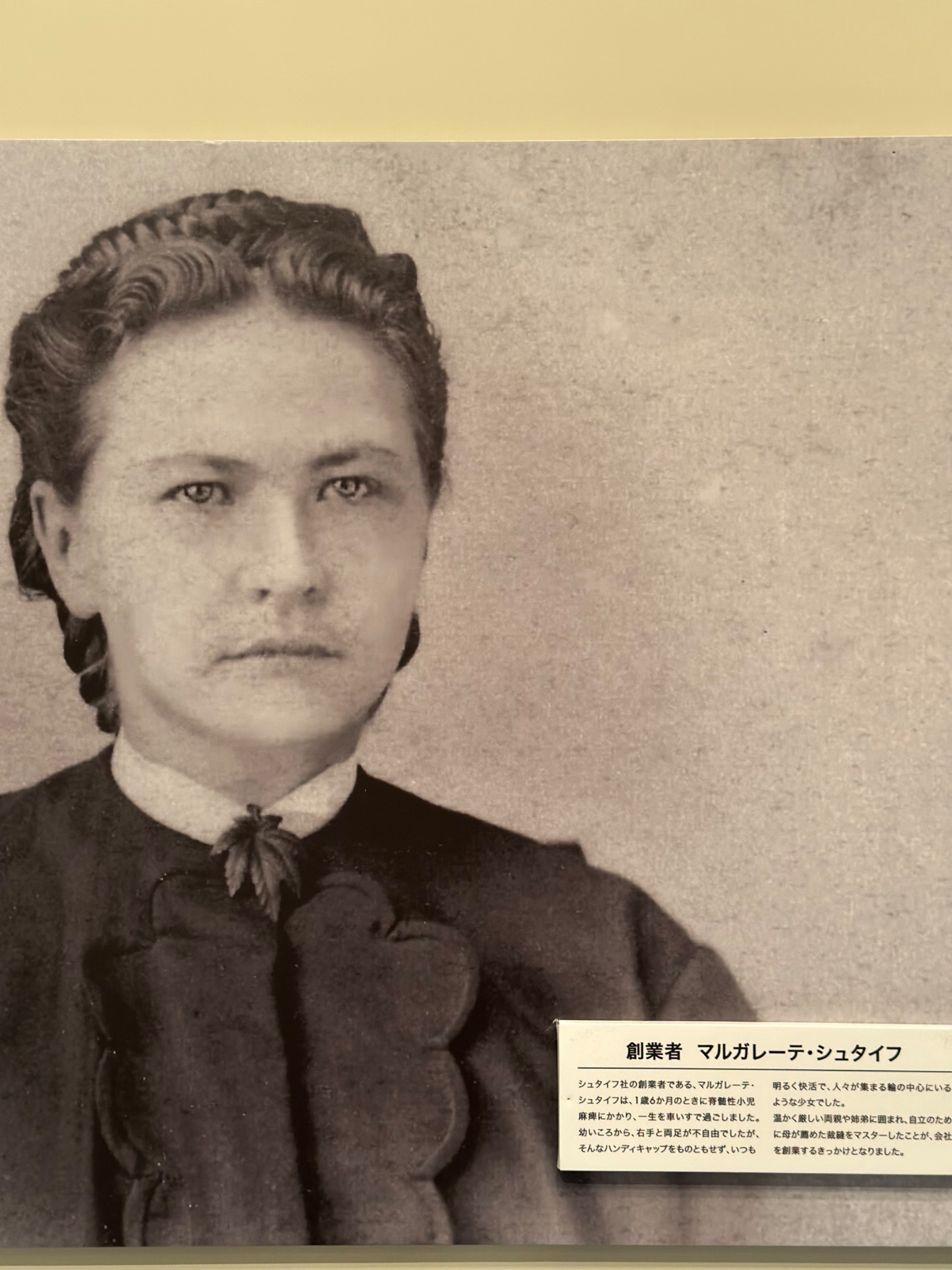 こちらのお写真の女性が、創業者のマルガテーレさん。ご病気の兼ね合いから車イスで生活をされておられましたが、自立のためにはじめたお裁縫が、のちにシュタイフ創業へと繋がります。