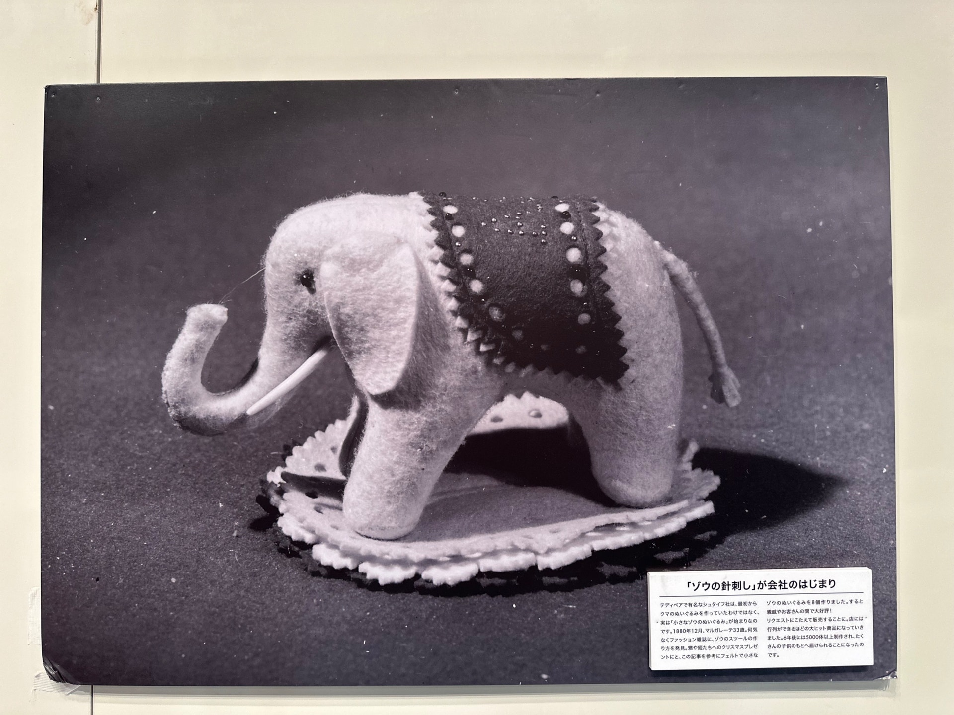 下にある、フェルトの象🐘!これは針刺しですが、親類にプレゼントとして作ったところ評判を呼び、一般向けに販売されることになったのだとか。結果、5,000体以上が制作され、たくさんの方に届けられました☺️